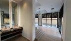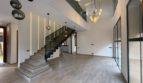 - Un salon spacieux en double hauteur, baigné de lumière naturelle grâce à ses grandes baies vitrées, sublimé par un design contemporain, des luminaires suspendus élégants, et un escalier moderne avec garde-corps en verre.